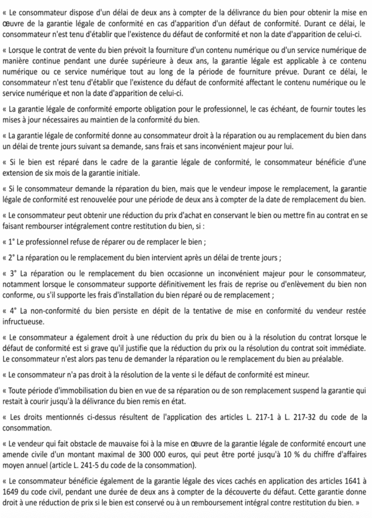 L’Entreprise répond des défauts de conformité existant au moment de la délivrance du bien qui apparaissent dans un délai de 2 ans à compter de celle-ci, conformément aux articles L.217-4 et suivants du Code de la consommation. En revanche, pour les biens d’occasion, la durée de la présomption d’antériorité des défauts est de seulement 6 mois.